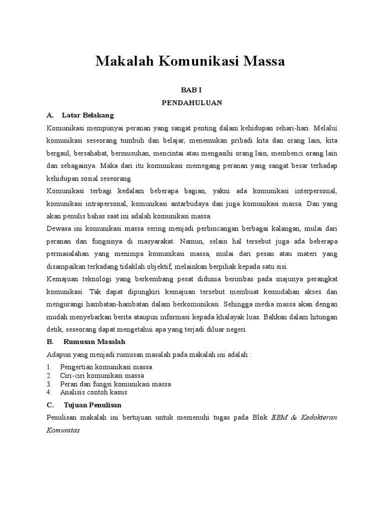 KOMUNIKASI MASSA MAKALAH Disusun Guna Memenuhi Tugas Mata Kuliah. BAB I PENDAHULUAN 1 11 Latar Belakang Teknologi elektronik yang semakin maju telah menyebabkan dunia semakin kecil. Untuk membedakan dengan komunikasi interpersonal yang dapat kamu pelajari dengan teori komunikasi interpersonal atau teori komunikasi intrapersonal yang bisa kita pelajari lewat teori komunikasi intrapersonal kita dapat melihat pendapat salah satu ilmuwan yang menunjukkan ciri khas teknis dari komunikasi massa dalam arti komunikasi yang melalui media massa.